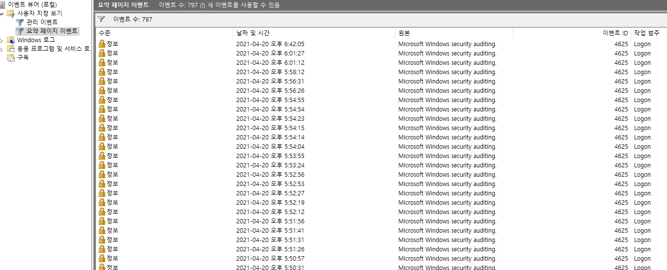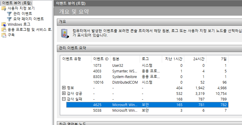 그래서 이벤트 뷰어를 살펴봤다.