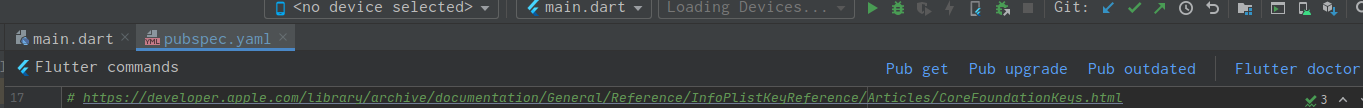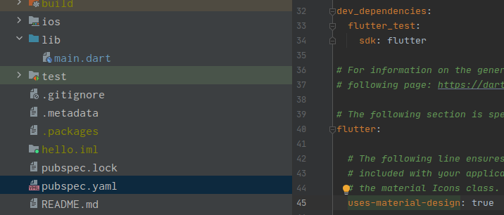 * Material 앱이란다. 플러터는 메테리얼위젯을 제공한다. 어쩌구. uses-material-design: true in flutter section of pubspec.yaml (false로 바꿔봤는데 딱히 아직 차이를 모르겠다.)