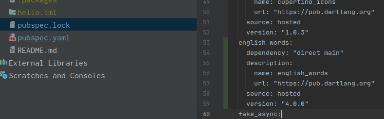 제대로 가져왔으면 pubspec.lock파일에 english_words가 아래처럼 자동 생성되어 있다.